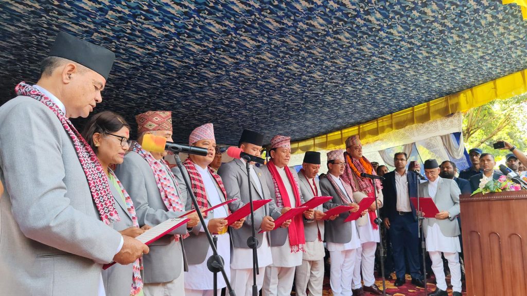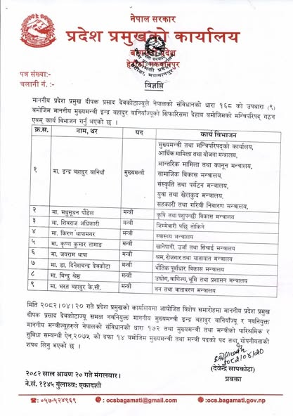 मुख्यमन्त्री बानीयाँसगै सरकार साझेदार नेकपा एमालेबाट ६ जना र नेपाली कांग्रेसबाट मुख्यमन्त्री बानीयासहित तीन मन्त्रीलाई शपथ खुवाएको छ भने ५ जना मन्त्रीको नियुक्ति भने बाँकी छ ।
