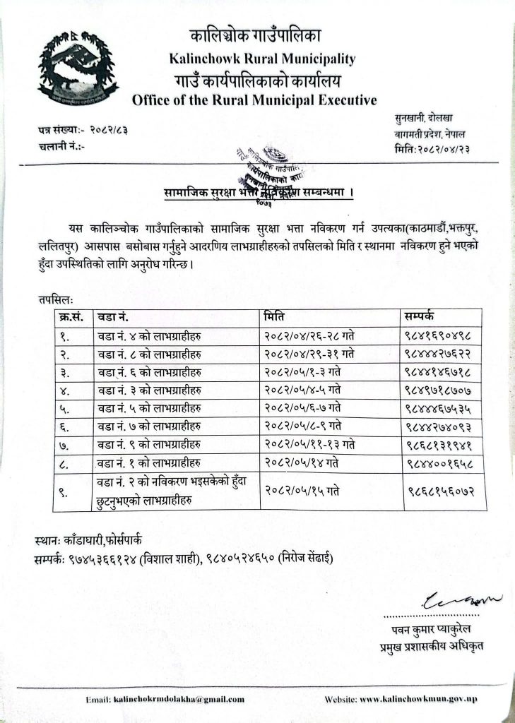 कालिन्चोक गाउँपालिकाका प्रमुख प्रशासकीय अधिकृत पवन कुमार प्याकुरेलद्वारा हस्ताक्षरित सूचनामा लाभग्राहीहरूको सुविधाका लागि मिति र सम्पर्क व्यक्ति तोकिएको उल्लेख गरिएको छ।