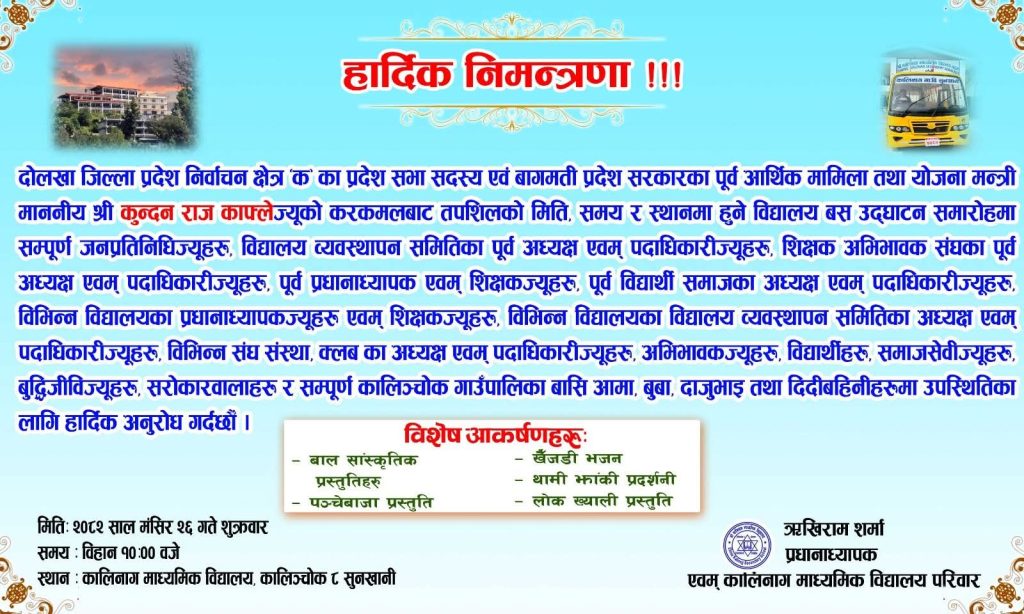 सुनखानी — कालिनाग माध्यमिक विद्यालयले आफ्नो शैक्षिक सेवा सुदृढीकरणका लागि विद्यालय बस सेवा सञ्चालन गर्ने भएको छ। बस उद्घाटनका लागि विशेष कार्यक्रम यही मंसिर २६ गते बिहान १० बजे विद्यालय परिसरमा आयोजना गरिने विद्यालयले जनाएको छ।
