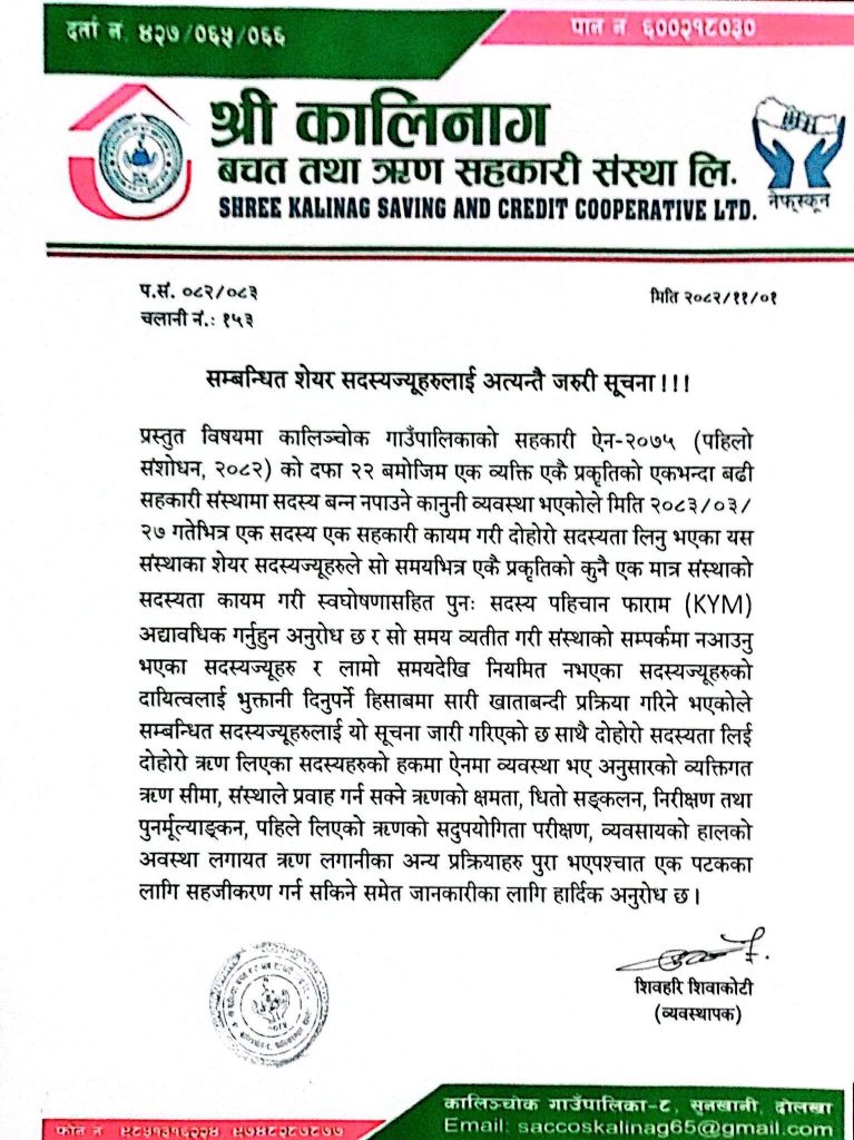 सुनखानी,१ फागुन : कालिनाग बचत तथा ऋण सहकारी संस्था लिमिटेडले आफ्ना शेयर सदस्यहरूका लागि सदस्य पहिचान (KYM) अद्यावधिक गर्ने प्रक्रिया सुरु गरेको छ।