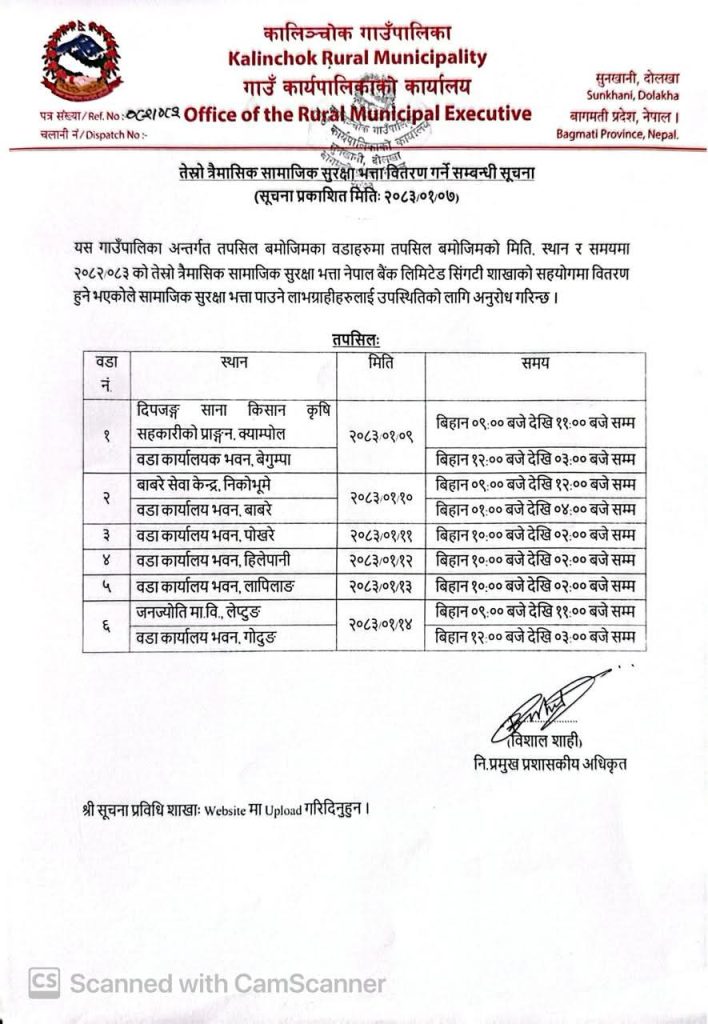 सुनखानी, दोलखा : कालिञ्चोक गाउँपालिका मा तेस्रो त्रैमासिक सामाजिक सुरक्षा भत्ता वितरण हुने भएको छ।