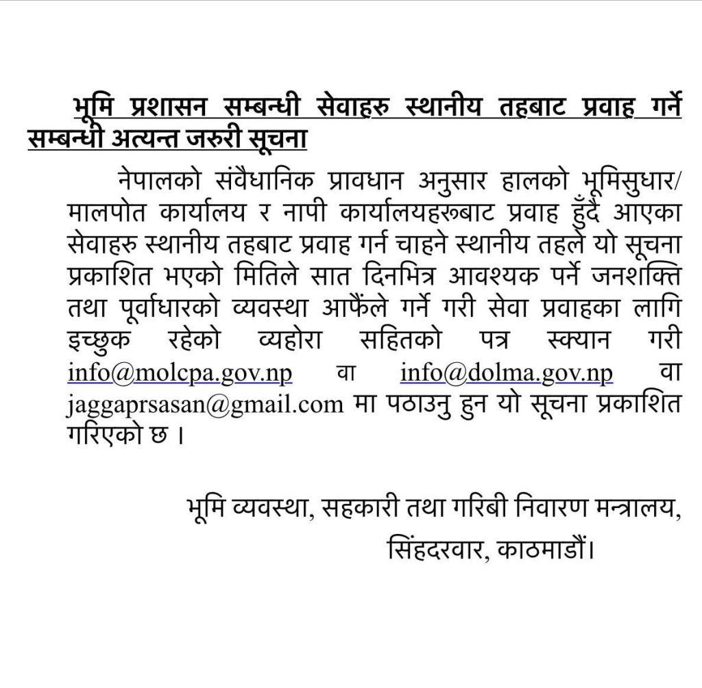 काठमाडौं । भूमि प्रशासनसँग सम्बन्धित सेवा सहज र नजिकबाट उपलब्ध गराउने उद्देश्यसहित सरकारले मालपोत र नापी सेवा स्थानीय तहबाटै सञ्चालन गर्ने तयारी गरेको छ।