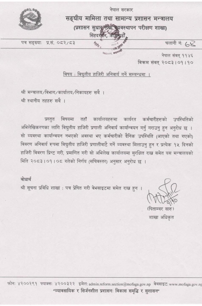 सङ्घीय मामिला तथा सामान्य प्रशासन मन्त्रालयले सबै मन्त्रालय, विभाग, कार्यालय, निकाय तथा स्थानीय तहलाई पत्राचार गर्दै कर्मचारीहरूको उपस्थितिलाई व्यवस्थित र पारदर्शी बनाउन विद्युतीय हाजिरी प्रणाली कार्यान्वयन गर्न निर्देशन दिएको हो।